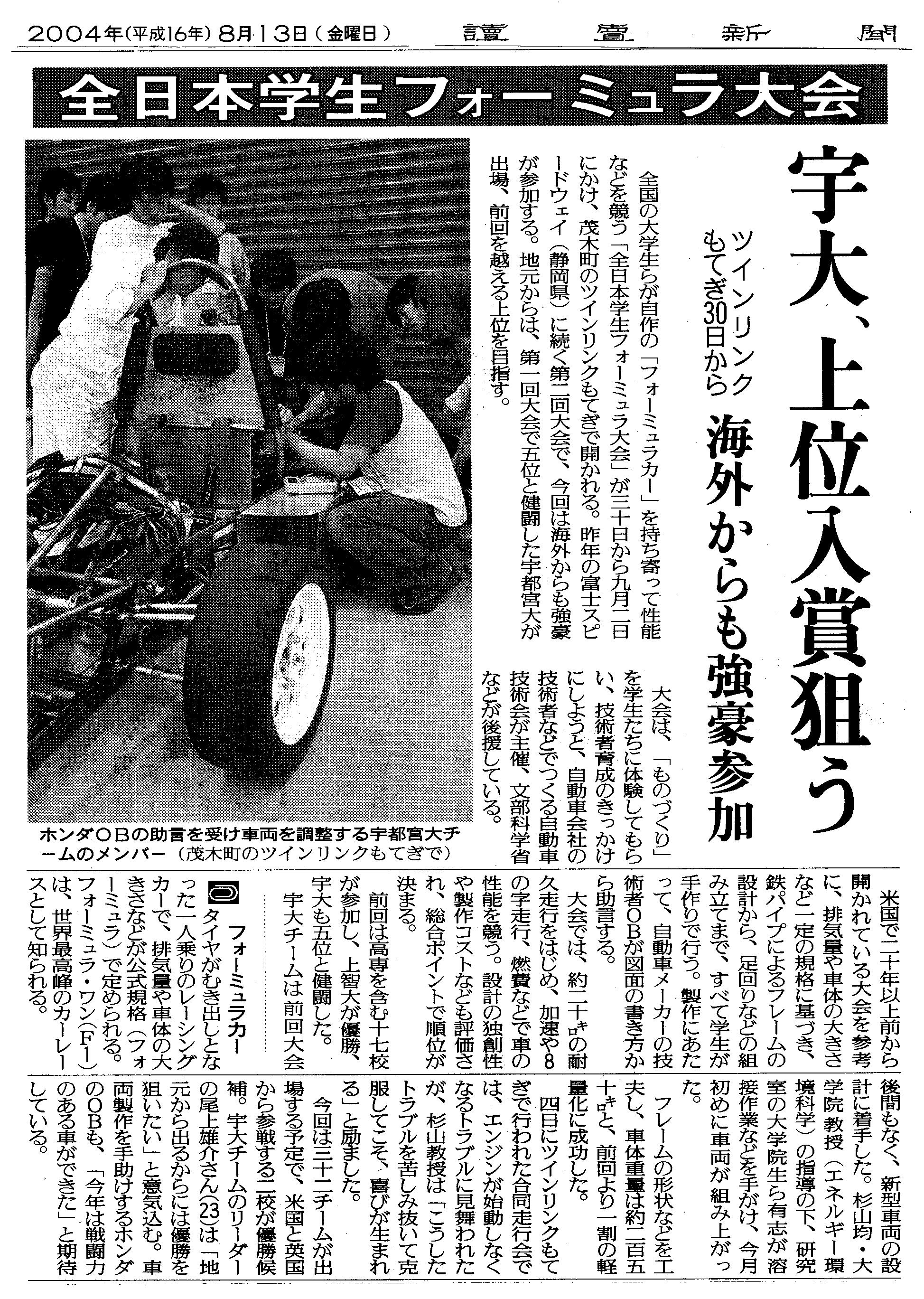 Washington大学滞在中に見聞したFormula SAEに魅せられ,帰国後に導入を決め活動を開始しました.Formula SAEは,アメリカの教育システムの一つであり,基本的に学生による実践工学教育です.(社)自動車技術会関東支部も,その教育効果に早くから着目し,同じ目的から,自動車技術会と共同でFormula SAE活動を開始しました.今回,Formula Car製作するにあたり多くの民間企業のご支援と,民間のボランティア活動(ホンダ・マイスタークラブ)を受けました.ここに感謝致すとともに心よりお礼申し上げます.