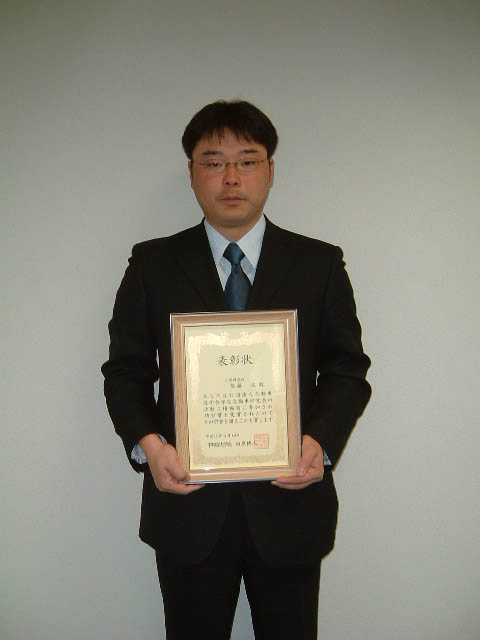 宇都宮大学チームリーダ,佐藤 誠君は,合同チームをまとめた功績が認められ,自動車技術会から学生自動車研究会功労賞を受賞しました.チームを代表し心からお祝い申し上げます.受賞は,2003年3月1日,武蔵工大にて行われました.また,宇都宮大学からも功労賞受賞に対して,3月19日学生表彰を受けました.